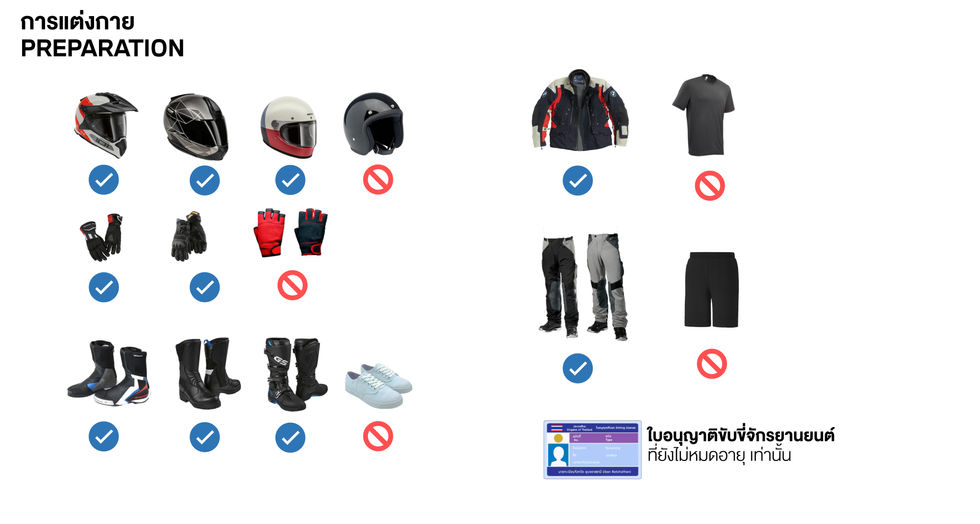 ผู้ร่วมกิจกรรมต้องเตรียมเครื่องแต่งกายและอุปกรณ์การขับขี่ ตามที่ระบุในเงื่อนไข